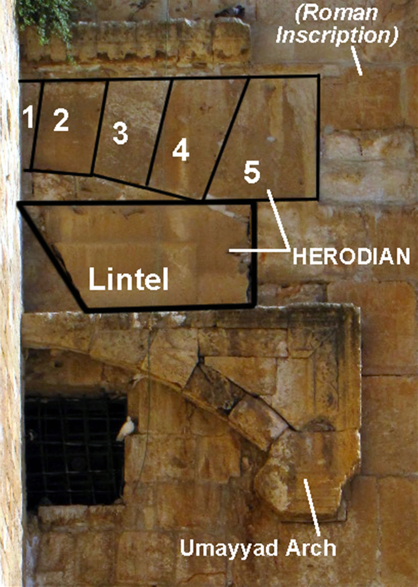 Above the Umayyad Arch (built in the 600's AD by the Muslims) are four trapezoidal stones which form the arch of Herod's New Testament Temple Mount entrance. Below the trapezoidal stones is a large horizontal stone with a wide margin and boss carved into it. This is the lintel for the Herodian Double Gate.