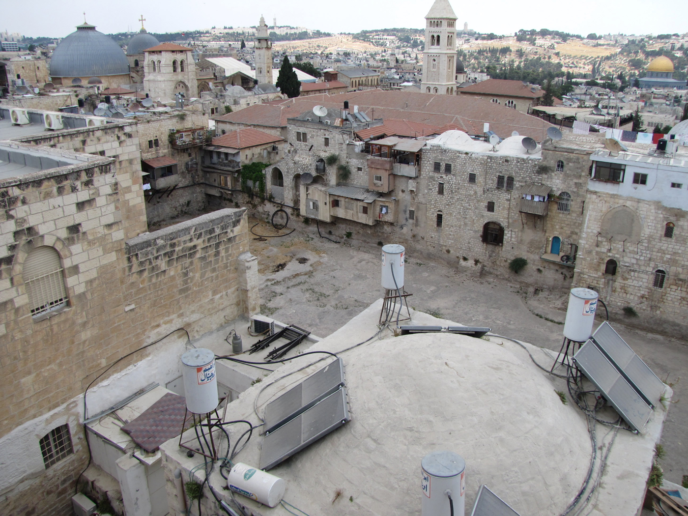 A view from on top the Petra Hotel of Hezekiah's Pool located in the Christian Quarter in Jerusalem which was outside the north wall of Old Testament and New Testament Jerusalem until 41 AD. The Church of the Holy Sepulcher is to the top left and marks the site of Jesus crucifixion with the small grey dome with a cross on top. The site of Jesus' burial and resurrection is under the large grey dome. The Dome of the Rock on the Jewish Temple Mount is to the far right at the top of this photo.