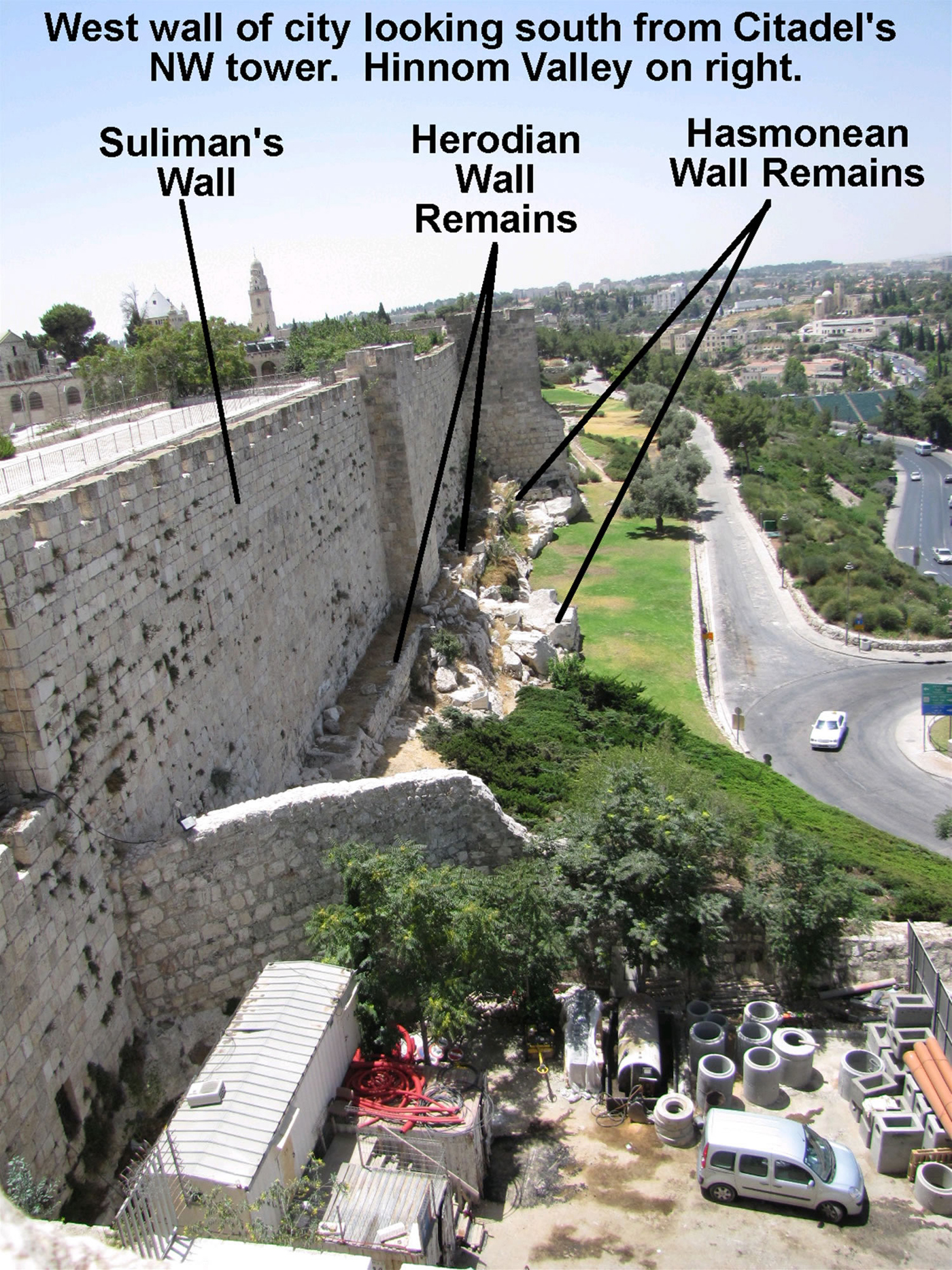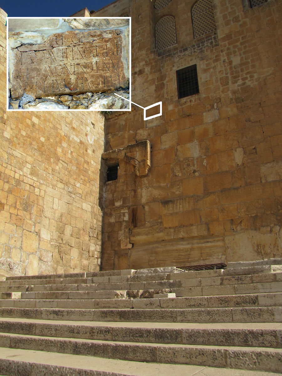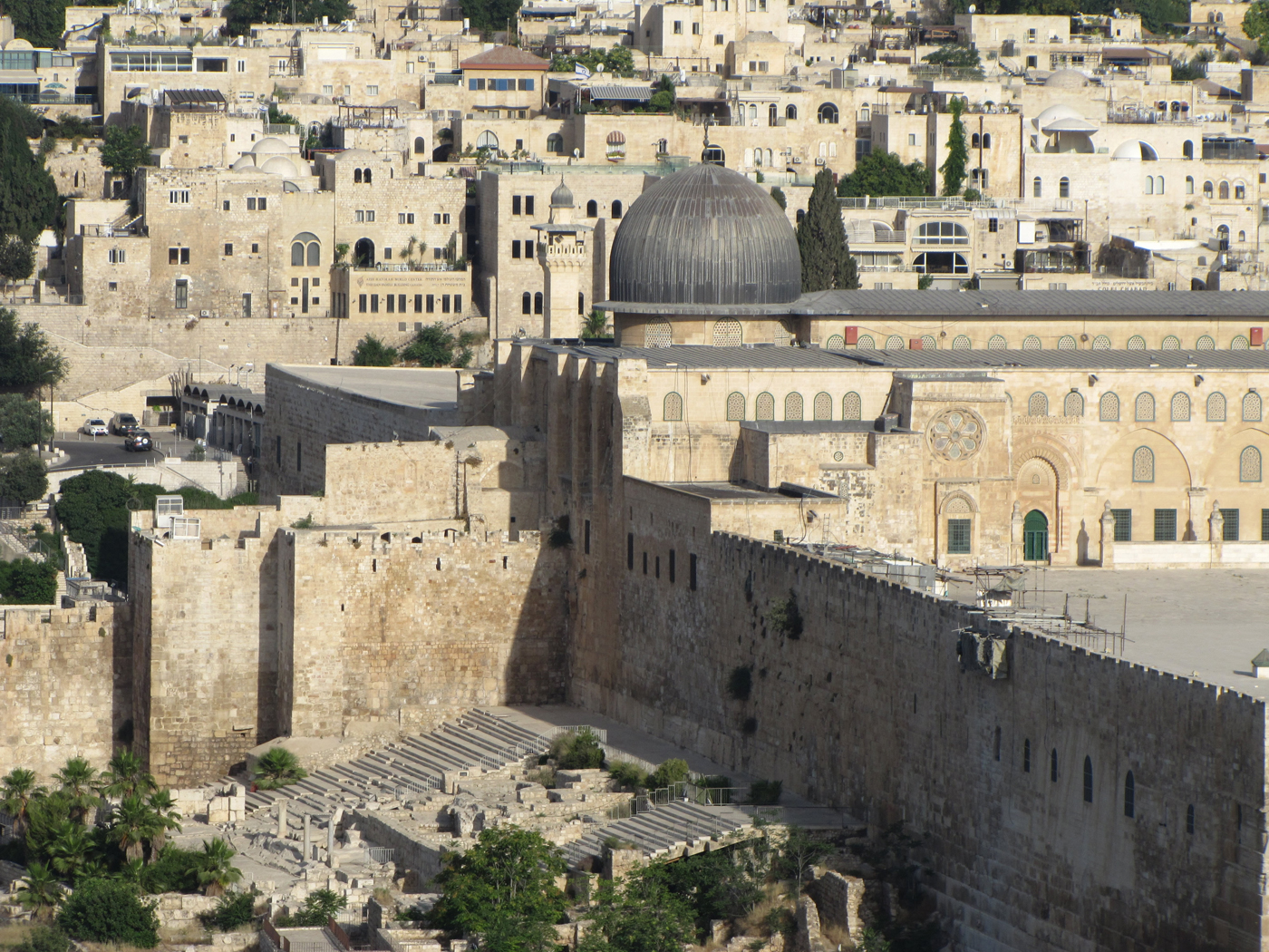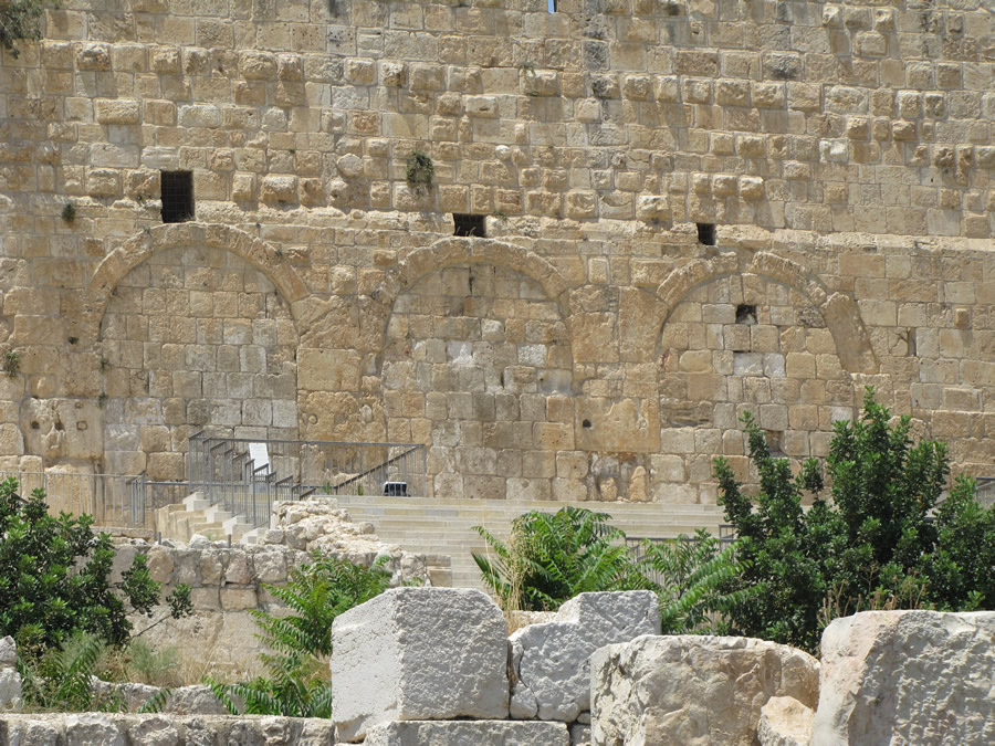 The south side of the Jewish Temple Mount. The steps led up to the Double Gate and the Triple Gate in New Testament times. The grey dome is the Al Aqsa Mosque which stands where Solomon's Porch once stood on the Temple Mount which extends to the right.
