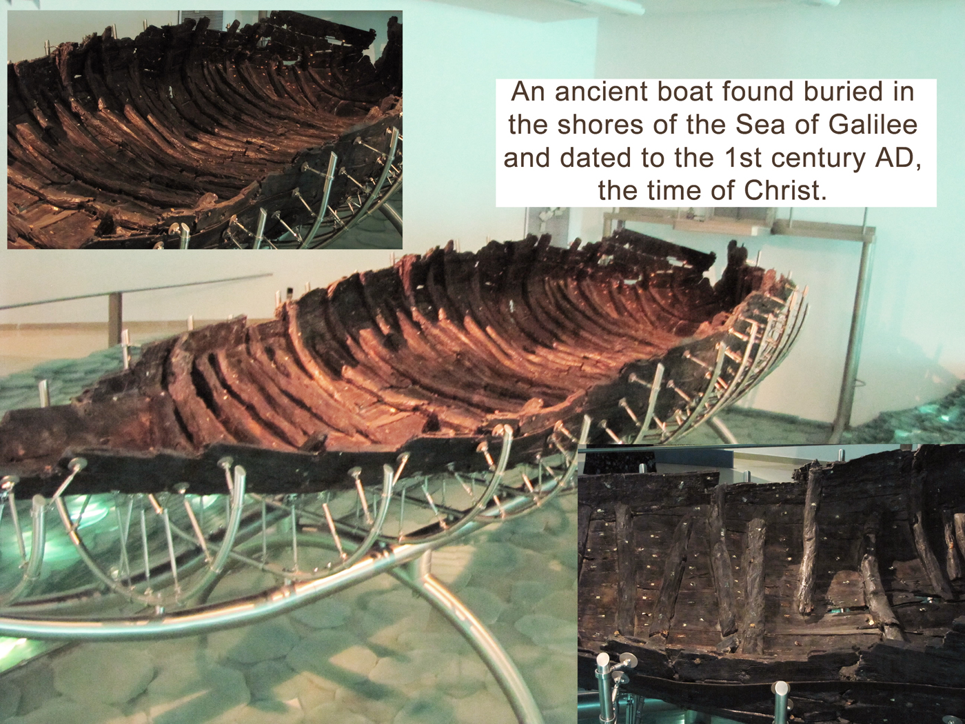An ancient first century AD boat found buried in the mud near the shore in the Sea of Galilee. This boat would have been in use during the time of Jesus. details