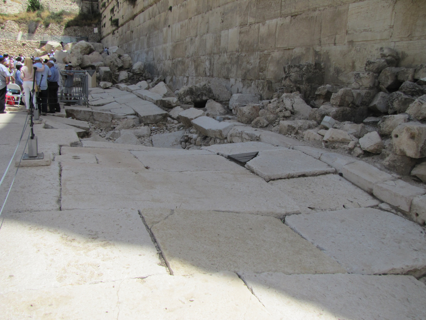 Pavement stones running along the west wall of the temple mount show the result of being crushed by stones that fell from the temple mount above during the Roman destruction of the city and the temple in 70 AD. (click on image for larger size)