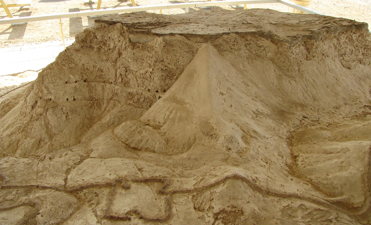 This is a model of the ramp built by the Romans to capture Masada in 72 AD. Notice the rock wall that was built by the Romans to encircle Masada to prevent Jews from escaping. Also, see the wall built to encircled the location of one of their Roman military camps. (More Masada here)