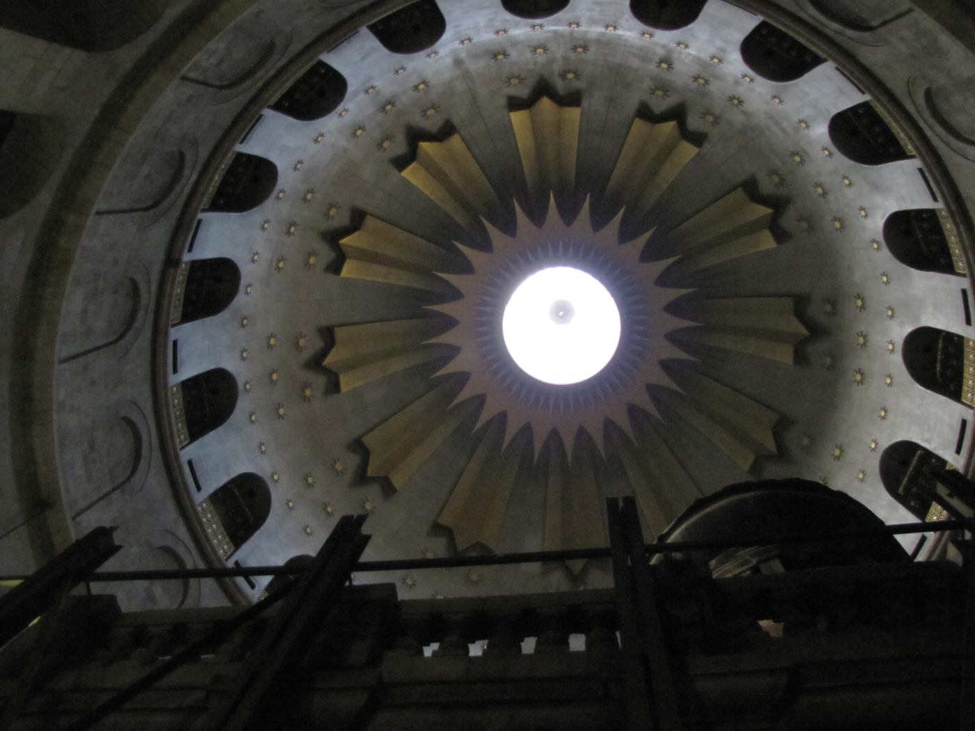 The dome of the Rotunda over the tomb of Christ. This is the inside of the larger grey dome of the Church of the Holy Sepulcher. Constantine’s spectacular rotunda with its large dome covering the tomb of Christ was intended to declare Christ’s victory and reign. Eusebius, the church historian from the days of Constantine, quoted Constantine as ordering a rotunda built for Christ that was “of a magnificence worthy of his wealth and of his crown. (details)