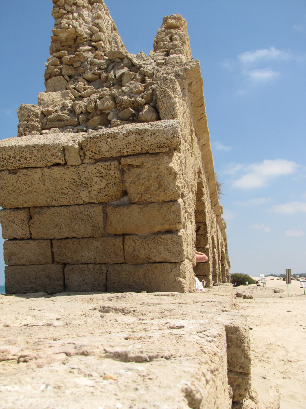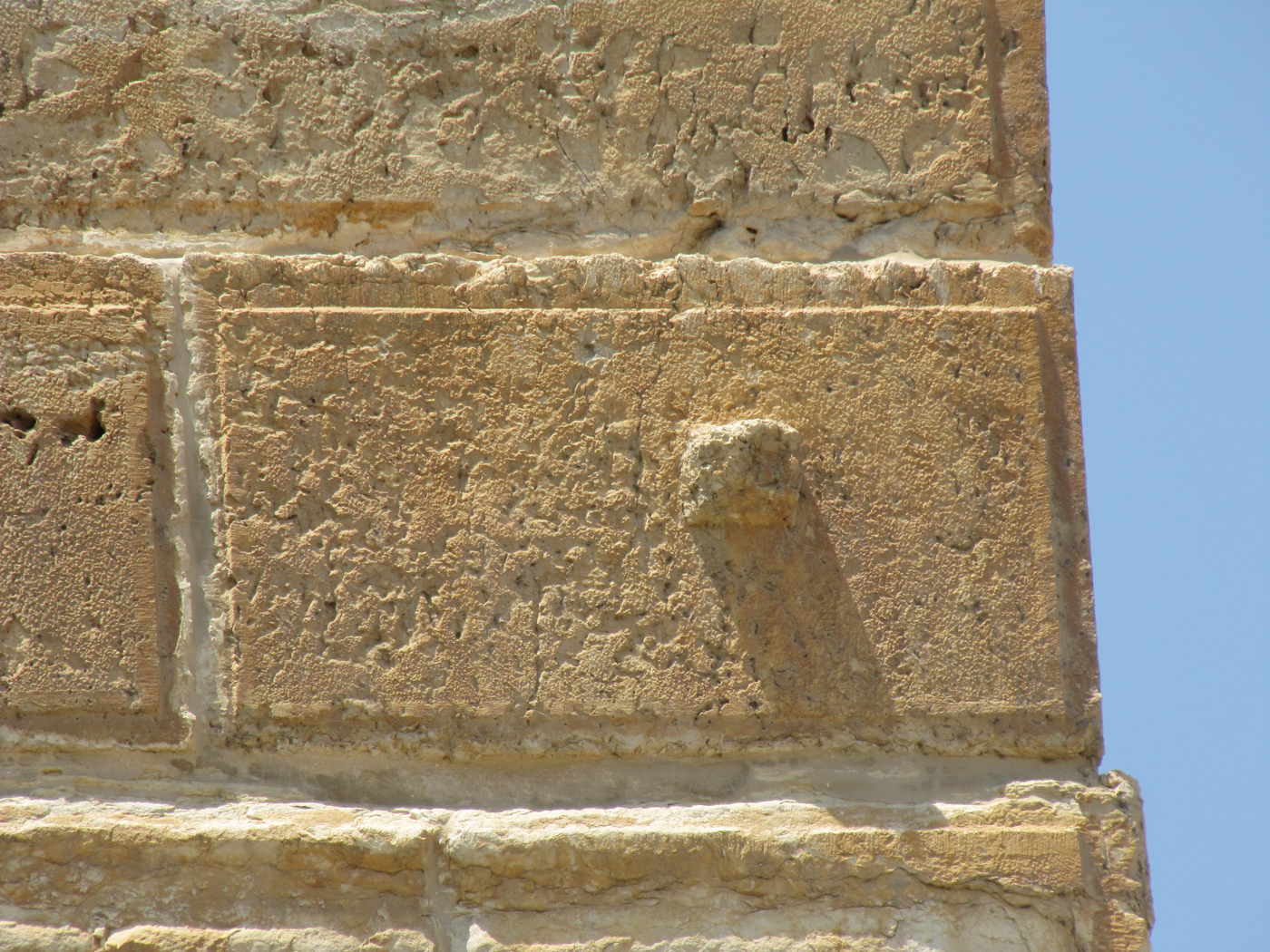 This is a herodian ashlar stone on the SE corner of the Temple Mount retaining wall in Jerusalem. The protruding square knob on the side was used for attaching ropes to pull and position the block on the wall. Once the block was set in place this knob was usually removed by the stonemasons.