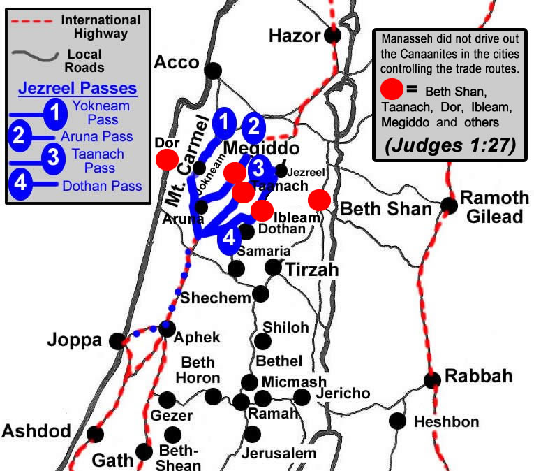 The Canaanites maintained control of the Jezreel Valley by refusing to give up the cities that controlled the passes. This created a wedge between Israel’s occupation in the south and the tribes north of the Jezreel Valley. Canaanite control of these passes and the Jezreel Valley enabled the chariots of the Canaanites to be deployed effectively, which complicated things for the forces of Manasseh.