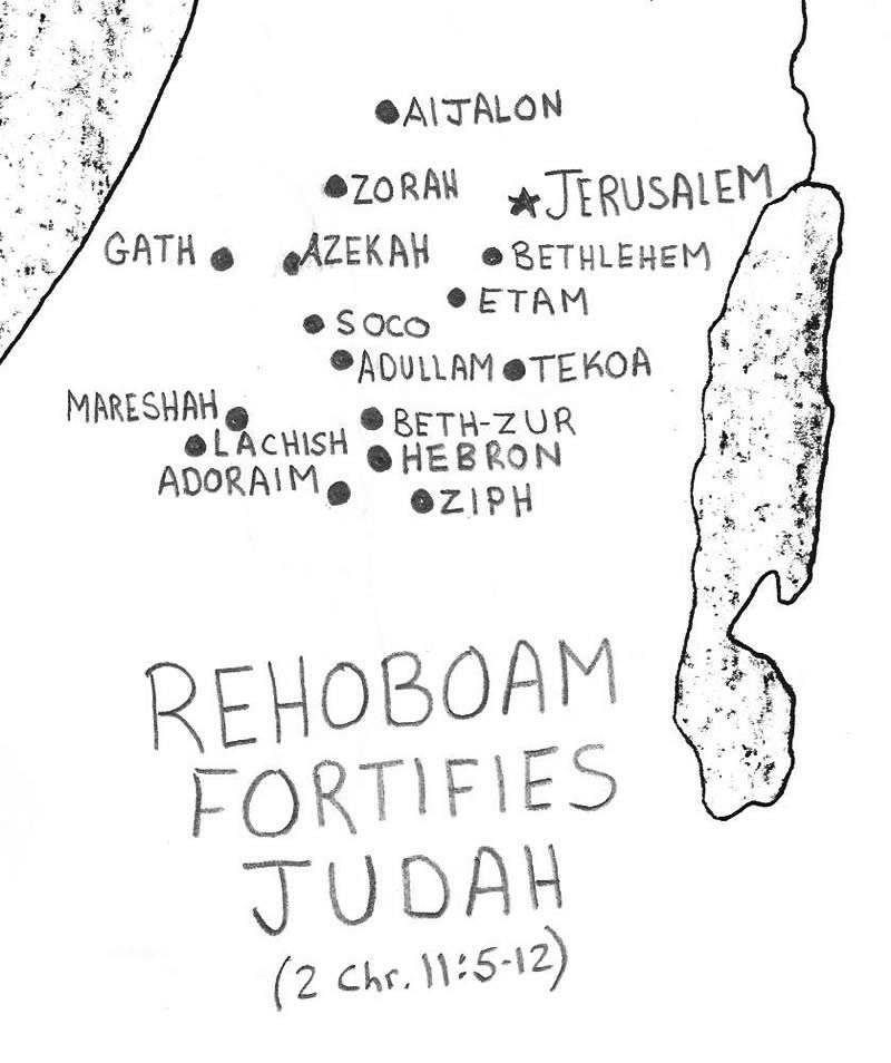 5 Rehoboam lived in Jerusalem and built up towns for defense in Judah: 6 Bethlehem, Etam, Tekoa, 7 Beth Zur, Soko, Adullam, 8 Gath, Mareshah, Ziph, 9 Adoraim, Lachish, Azekah, 10 Zorah, Aijalon and Hebron. These were fortified cities in Judah and Benjamin. 11 He strengthened their defenses and put commanders in them, with supplies of food, olive oil and wine. 12 He put shields and spears in all the cities, and made them very strong. So Judah and Benjamin were his.
