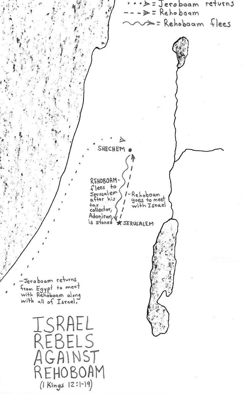 In 1 Kings 12:1-19 the northern ten tribes of Israel rebelled against Solomon's son, Rehoboam, when he became king. This map gives some details.