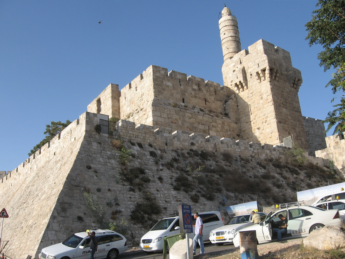 The Citadel as viewed from outside the Joppa Gate and above the Hinnom Valley. This was the site of Herod's palace in Jerusalem and also the fortress of the Maccabees. Since Bible times this fortress has been used by the Romans, the Muslims, the Crusaders, etc.