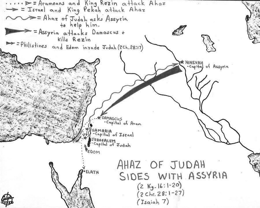Details of King Ahaz of Judah siding with Assyria in disobedience to God's word to him through Isaiah in Isaiah 7. Text of Scripture is 2 Kings 16:1-20 and 2 Chronicles 28:1-27.