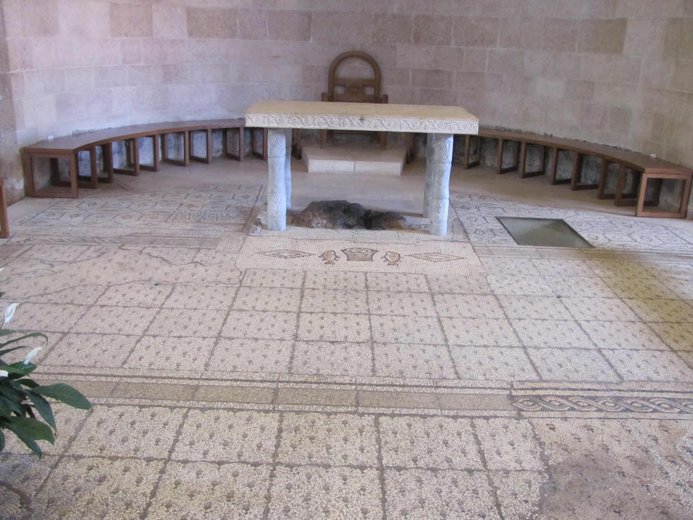 The altar with the famous fish and loaves mosaic at Tabgha in the Heptagegon Church in front of the altar over the rock where supposedly Jesus multiplied the fish and loaves. There is no archaeological evidence for this, but it is the traditional place in this ancient church. Traditionally it is at this location on the north shore of the Sea of Galilee that Jesus ate his post-resurrection breakfast with the disciples and spoke to Peter about his calling and his future (John 21). (Details here and here.)