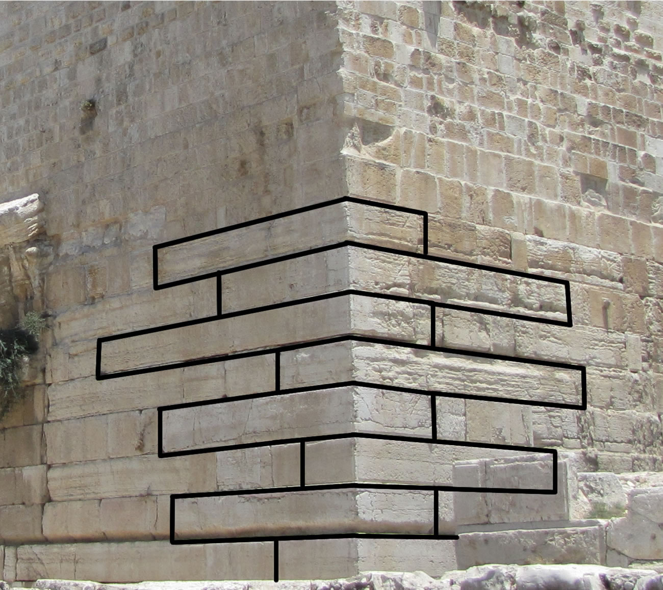 8 feet wide and 3.5 feet tall. As seen in this photo, the workers used what is called header and stretcher construction where the stones are laid west and south in an alternating pattern. Because of the great size of the stones and this style of interlocking construction, all the corners of Herod’s Temple have been preserved to a great height – the Romans were unable to move them. This southwest corner has been preserved to the height of twelve Herodian courses of original ashlars; eight are visible here and the other four courses can be seen in photos above. Notice the edge of Robinson’s Arch on the left side of the photo. (Details concerning Herodian Ashlar blocks.)
