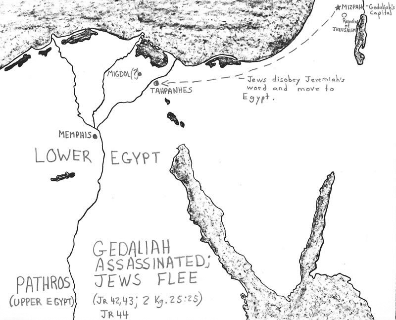 Details of the Jews flight to Egypt after Gedaliah was assasinated in Jeremiah 41-44 and 2 Kings 25:25-26 located on a map.