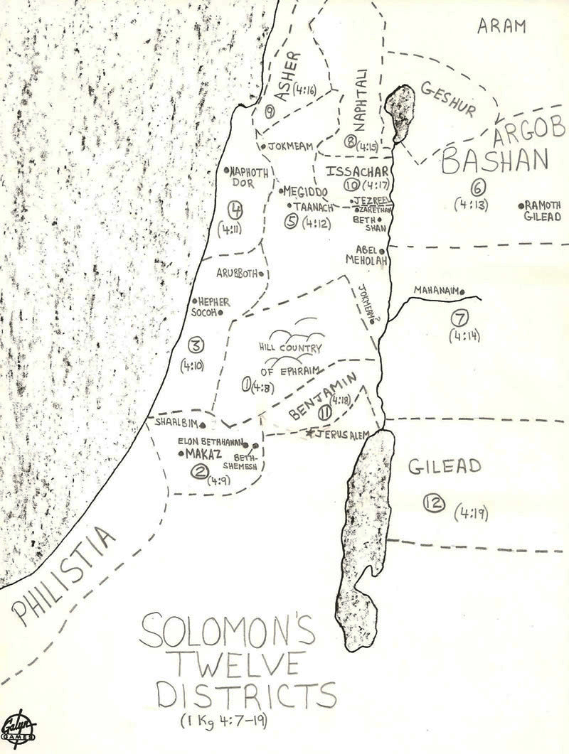 Solomon did what Samuel had warned Israel about if they received the king they had asked for. (1 Samuel 8:10-22). King Solomon made a large central government in Jerusalem, staffed it and then increased the taxes on the rest of the nation. The nation was divided into twelve districts (map of districts) which were roughly divided according to their tribal territory assigned by Joshua. Each district would provide the financing of the kingdom for a month each year. These taxes and provisions would be collected by the district’s chief officer. The tribe of Judah was exempt from taking their turn which, obviously, was not going to be accepted easily by the northern tribes.Solomon’s quest for wisdom was a traditional value in the ancient Near East. Egyptian writings and sayings of wisdom from Amenemope a hundred years before Solomon are still available. Even in the Akkadian Empire (Mesopotamia) of 2300 BC wisdom was sought and recorded. Some of the wisdom from the Akkadian Empire comes to us in the recordings of the Wisdom of Ahiqar. Details 1, 2