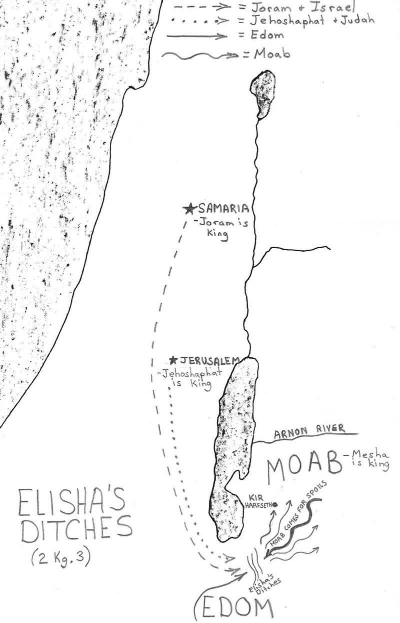 Details from 2 Kings 3 when Judah and Israel went to war agains Moab and Elisha had the troops dig trenches to supply the troops with water and deceive the enemy.