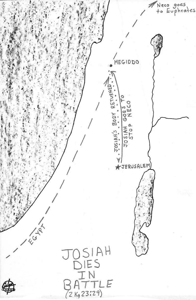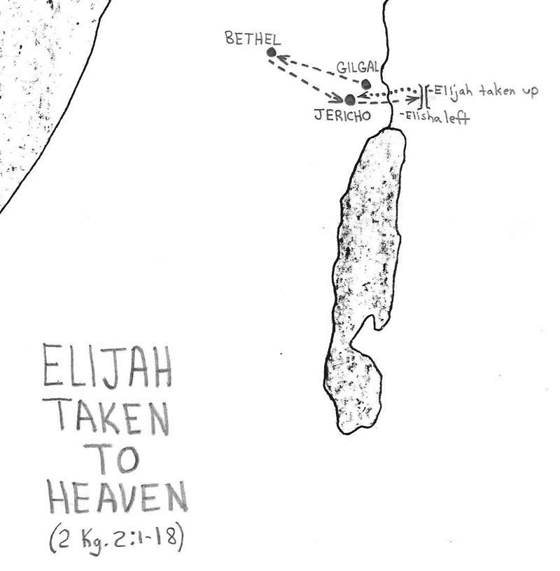 A map identifies the locations mentioned in 2 Kings 13:20-21 and associated with the raising of a dead man by the bones of Elisha.