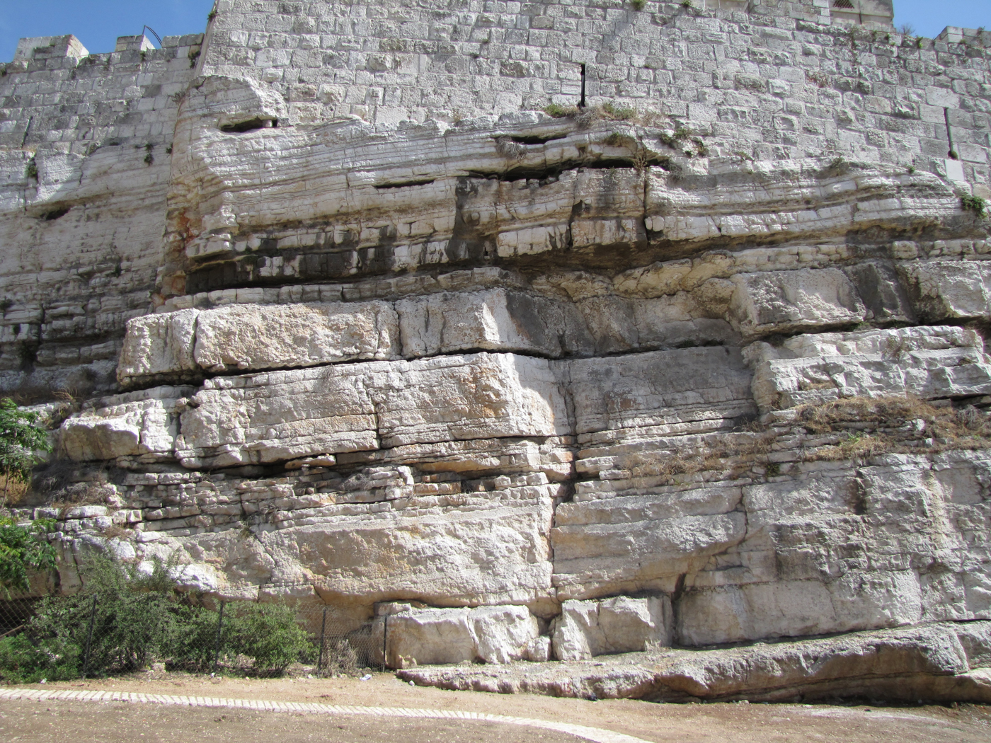 Bedrock of Mount Moriah on the north side of the Old City Jerusalem. This bedrock has been part of the city walls since Bible times. Even today the north walls of Jerusalem set at the top of this bedrock from Mount Moriah.