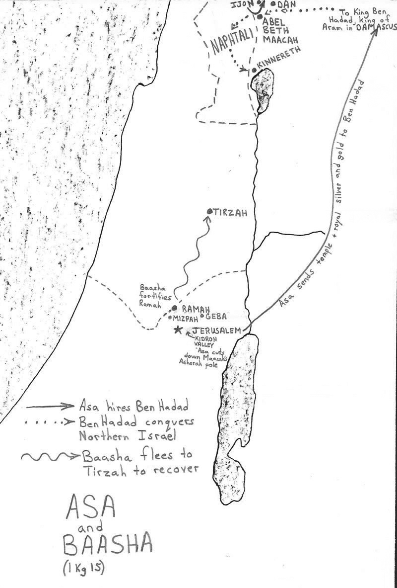 Asa, King of Judah, and Baasha, King of Israel, had military conflicts that are recorded in 1 Kings 15. This map details the locations and movements.