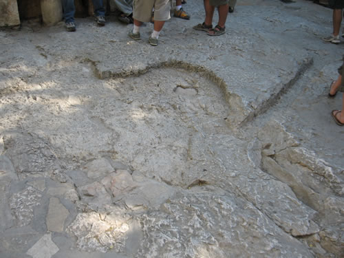 A carved pool in by the edge where the stone rolled. This would have been used for footwashing during the early church.