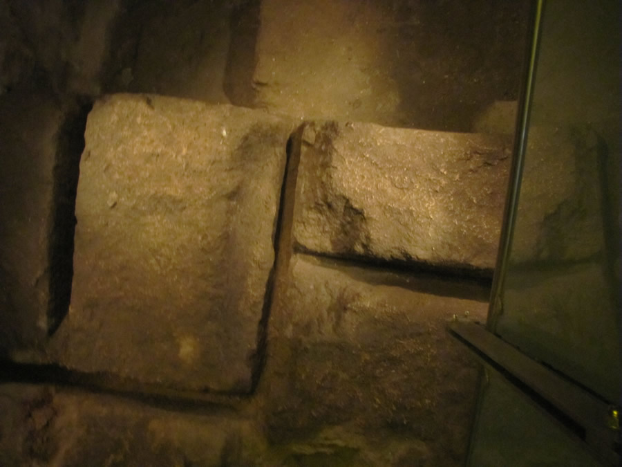 A close look at the ashlar with the wooden (stone) block holding the plaster in place in the Western Wall tunnel.