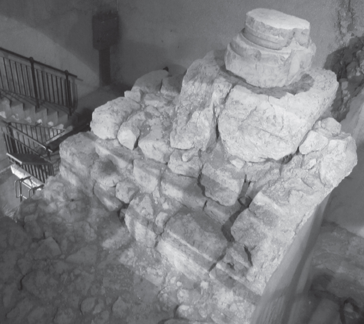 We can see four things in the remains of this wall, which is located in the northern part of the Jewish Quarter: 1) It was part of the gate system that protected the western section of the city on the north wall. The entrance to the city is on the right of this photo; 2) The remains of the wall built by the Hasmoneans around 150 BC can be seen in the stones at the bottom of the photo; 3) To the left and down, the stones form a straight seam which divides the wall into two sections – right and left, or west and east. The left section was the base of a tower that guarded the gate; 4) The column and its base, seen on the top of the wall, are from the Byzantine street called the Roman Cardo from 140 AD. Many of these Roman columns and much of the paved Cardo street can still be seen running through the Jewish Quarter.