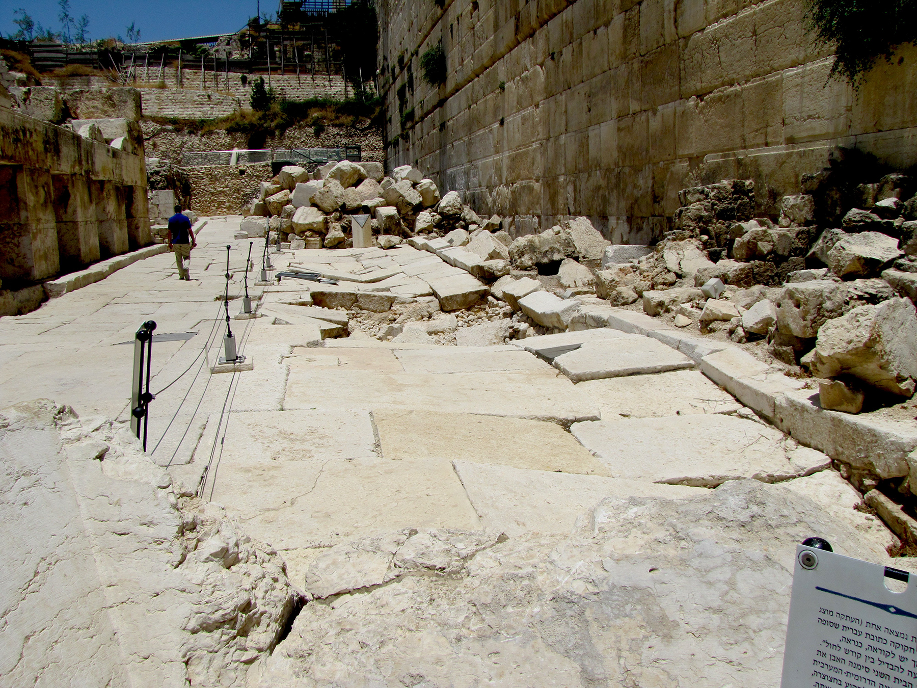 This photo, looking north with the Western Wall on the right, shows the pavement crushed by falling blocks of stone from the Roman destruction in 70 AD. In the bottom right quadrant of the photo the remains of shops built against the Western Wall can be seen. Shops lined both sides of this street and may have been controlled by the High Priest Annas.