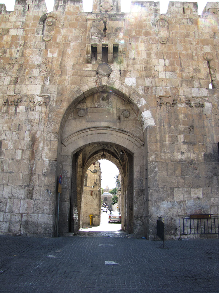 Although it was called the “Flowered Gate” (Bab ez- Zahr) because of the flower on the tower wall above it, Christians in the 1500s believed they had located Herod Antipas’ palace just inside this gate. The building was actually a Mamluk house, and Herod’s palace was in the Citadel on the west wall of the city just south of the Jaffa Gate. The opening we see today was actually cut into the front of the gate in 1875 by the Ottoman Empire. Originally the gate was entered from the east (left) through a small door in a larger door (wicket gate) which was rarely opened. The road leading to this gate cuts through a 2000-year-old aqueduct, which can still be seen on the west (right) side of this gate by locating the aqueduct’s covering stones.