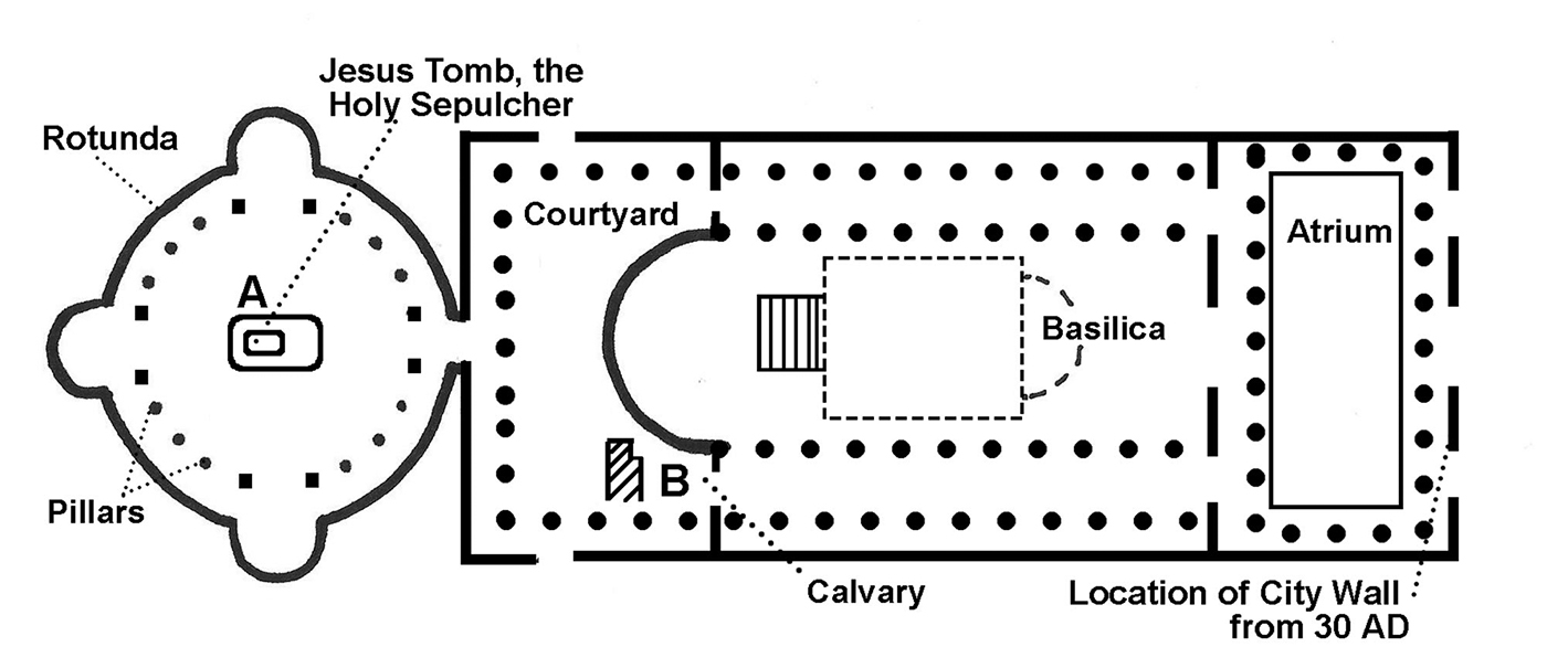 This is the floor plan of Constantine's magnificent and extravagant Church of the Holy Sepulcher. It consisted of a Basilica, a colonnaded courtyard around Calvary, and a large colonnaded rotunda around Jesus’ tomb.
