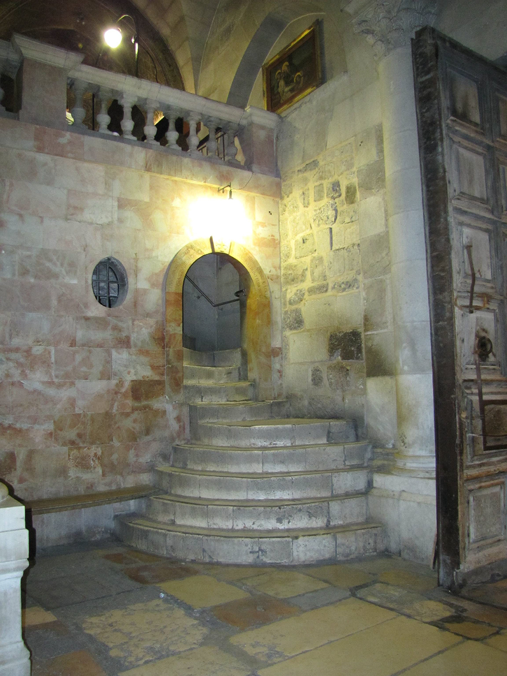 9) “Chapel of St. Helen.” We will then return to the “Entrance” to watch the Muslim gate keeper lock the door of the church at the end of the day for the divided Christian groups who worship here.