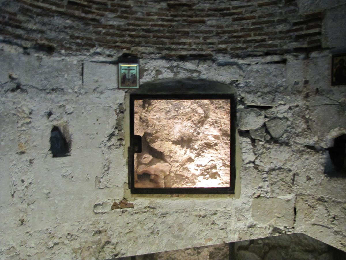 Through the glass case on a wall of the Chapel of Adam we can see a side view of the rock called Calvary.