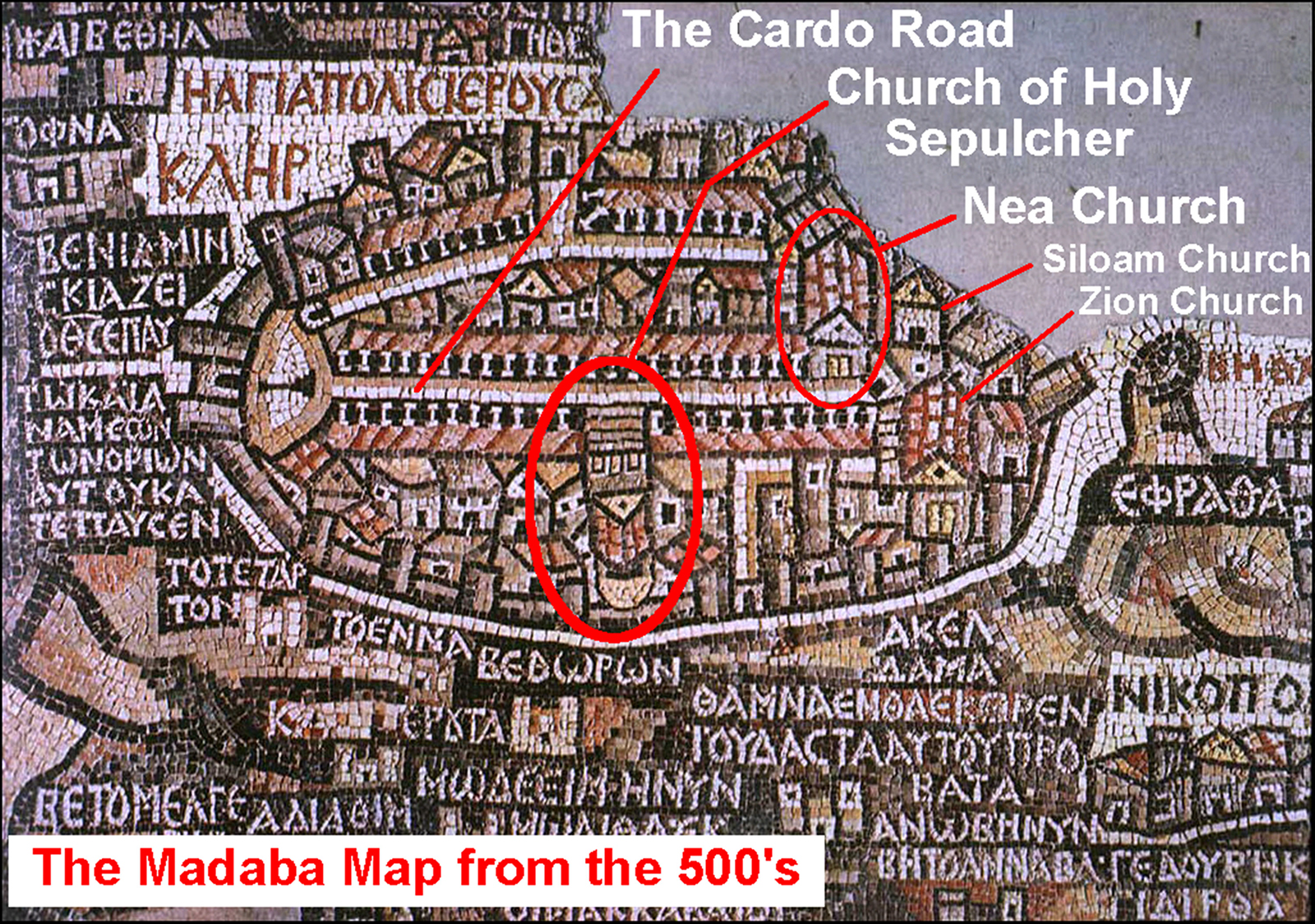 The Madaba map from the 500's AD shows the main Roman road called the Cardo with the most important Christian churches in relation to the Cardo. The Church of the Holy Sepulcher is shown with its basilica built in front of Calvary so that it extends all the way to the Cardo. Also, shown on the map are the Nea Church, the Siloam Church and the Zion Church. On Easter each year during the Byzantine era, a very large procession began at the Nea Church and progressed down the Cardo Street to the Church of the Holy Sepulcher.